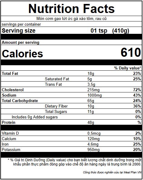 Trong số những món ăn tôi đã phát triển, Cơm gạo lứt ức gà đã nhanh chóng trở thành biểu tượng của sự cân bằng giữa dinh dưỡng và hương vị. Món “Cơm gạo lứt ức gà xào tôm, rau củ – không dầu” được tôi thiết kế với mục tiêu mang lại nguồn năng lượng tiêu chuẩn cho cơ thể, đạt đúng 610 Kcal với tỷ lệ dinh dưỡng hợp lý: