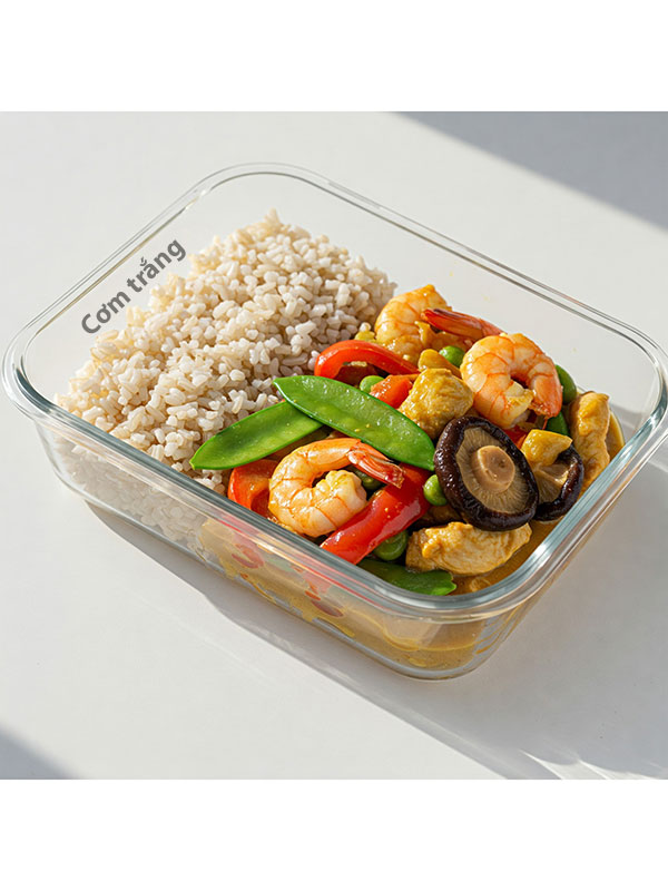 cơm trắng – xào ức gà, tôm,ớt chuông đỏ, đậu hà lan nấm hương