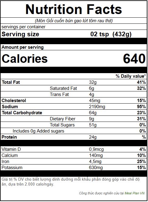 - Các chất đa lượng: Calories: 490 Kcal | Carbohydrates: 60g | Protein: 20g | Fat: 19g | Fiber: 7g